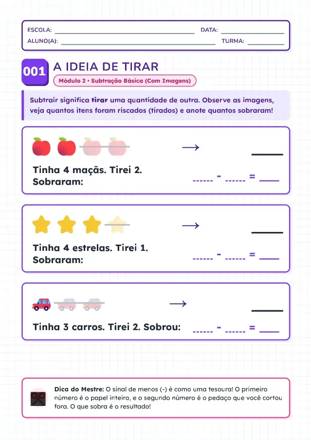 Atividades passo a passo que ensinam desde as contas básicas até subtrações com “empresta”, ajudando o aluno a entender e praticar com segurança.