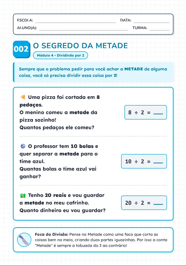 Aprenda divisão de forma clara e prática. Atividades que ensinam passo a passo desde as divisões simples até contas mais completas, com e sem resto.